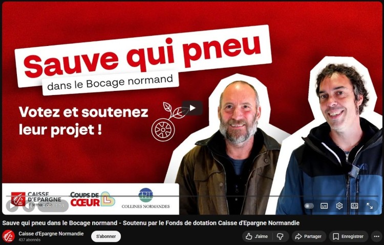 Le projet « Sauve qui pneu dans le bocage », porté par le CPIE Collines normandes est lauréat régional de l’appel à projets 2025 « Coups de cœurs » de la Caisse d’Épargne Normandie. Il est maintenant en lice pour la finale nationale aux côtés des lauréats des autres régions. Si tous ces « coups de cœur régionaux » sont ambitieux et enthousiasmants, seuls les trois projets qui obtiendront le plus de votes remporteront un prix de 5 000 €. Nous comptons sur vous (et sur votre vote !) pour nous permettre d’être lauréats et d’initier ainsi les travaux ! Merci !
